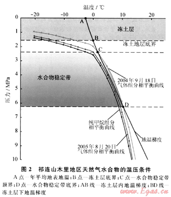 天然氣水合物形成于低溫高壓環(huán)境下,并需要有接近于飽和的氣源條件和充足的水源條件,同時氣體組成及其孔隙水鹽度也將影響到水合物能否形成并保持穩(wěn)定。由于中國凍土區(qū)的水源條件比較豐富,故制約水合物能否形成的關(guān)鍵因素是氣源條件和溫壓條件,這里先就溫壓條件進(jìn)行深入分析。