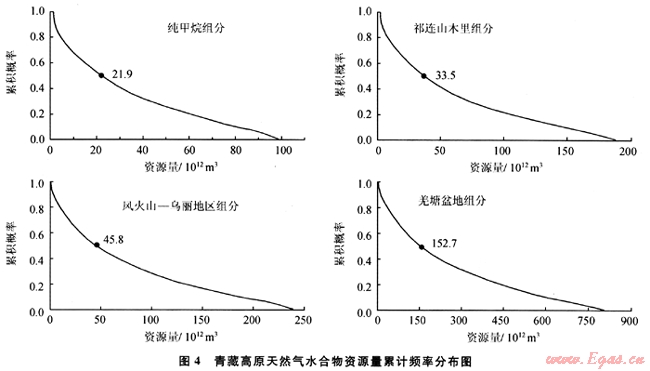 運用體積法估算天然氣水合物資源量時,由于上述5個參數(shù)特別是沉積物孔隙度(φ)和水合物飽和度(H)的取值范圍變化較大,從而影響了計算結(jié)果的可信度。因此,利用蒙特卡羅法對青藏高原的資源量再次進(jìn)行了估算。蒙特卡羅法是利用各種隨機(jī)變量的抽樣序列模擬給定概率的統(tǒng)計模型,得出數(shù)值解的近似統(tǒng)計值。體積法計算天然氣水合物資源量的5個參數(shù)中除分布面積(A)外,其他4個參數(shù)都是獨立的隨機(jī)變量,針對任一隨機(jī)變量蒙特卡羅法均可根據(jù)大量的實測數(shù)據(jù)(或理論假設(shè)數(shù)據(jù)),計算出相應(yīng)的頻率曲線,再根據(jù)頻率曲線給出一定頻率下的樣本值。然后根據(jù)一定概率下(例如0.5)各參數(shù)的樣本值計算出這一概率下的天然氣水合物資源量。蒙特卡羅法的估算結(jié)果顯示,在0.5概率下青藏高原純甲烷組分、祁連山木里組分、風(fēng)火山-烏麗地區(qū)組分和羌塘盆地組分天然氣水合物的資源量分別為21.9×1012m3、33.5×1012m3、45.8×1012m3和153×1012m3(圖4),均比體積法估算的相應(yīng)資源量要大。