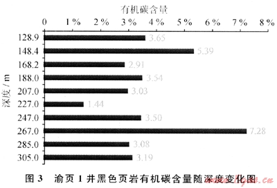 室內(nèi)實(shí)驗(yàn)研究的結(jié)果表明,龍馬溪組黑色頁(yè)巖中所含的有機(jī)質(zhì)類(lèi)型主要為腐泥型和偏腐殖混合型,有機(jī)質(zhì)成熟度(Ro)介于1.62%~2.26%之間,平均為2.04%,有利于天然氣的生成(現(xiàn)今主要為殘留熱解氣及生物再作用氣)。結(jié)合頁(yè)巖含氣量檢測(cè)結(jié)果,對(duì)渝頁(yè)1井部分巖心進(jìn)行了有機(jī)碳含量測(cè)試。燃燒法測(cè)定結(jié)果表明,深度128.9~305m之間10個(gè)樣品的有機(jī)碳含量值變化于1.44%~7.28%,一般達(dá)到3.0%左右,平均為3.7%(圖3)。由于有機(jī)質(zhì)是天然氣生成與吸附的主體,故有機(jī)碳含量的大小幾乎決定了頁(yè)巖中的天然氣含量,即有機(jī)碳含量與頁(yè)巖氣含量呈正比。