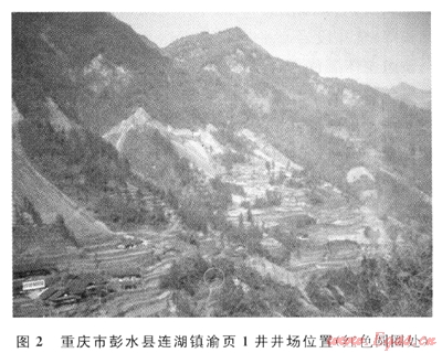 渝頁(yè)1井位于七曜山東部,該處沿北北東走向的群山連綿起伏,形成了與地質(zhì)構(gòu)造特點(diǎn)大體一致的地理景觀。由于構(gòu)造斷裂、剝蝕風(fēng)化及徑流沖刷等地質(zhì)作用,背斜核部常表現(xiàn)為溝、槽、谷等地形特征,與向斜核部在地表上的峰、嶺、脊等地形特征形成明顯對(duì)比。由于北東-南西和北西-南東方向的兩組斷裂在該地區(qū)同時(shí)發(fā)育,故地質(zhì)、地貌特征變化復(fù)雜。渝頁(yè)1井位于重慶市彭水縣連湖鎮(zhèn)北西西290°方位2~3km的曹家溝,屬連湖鎮(zhèn)樂(lè)地壩村所轄。區(qū)內(nèi)地形為北西高南東低,溝壑縱橫,相對(duì)高差1000m左右,其中渝頁(yè)1井位于山間河流切割沖刷所形成的“V”字形溝槽中(圖2)。