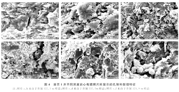渝頁(yè)1井龍馬溪組黑色頁(yè)巖宏觀及微觀裂縫發(fā)育,宏觀裂縫可分為高角度、近水平及雜亂狀3類(lèi),可表現(xiàn)為充填、半充填或無(wú)充填。一般裂縫多呈高角度延伸,巖心中可見(jiàn)的單一裂縫長(zhǎng)度為1.6m。觀察結(jié)果表明,各類(lèi)裂縫多表現(xiàn)為不均一的集中分布特點(diǎn),充填與不充填裂縫常有繼承性發(fā)育特點(diǎn)。巖心樣品電鏡掃描特征顯示,黑色頁(yè)巖微孔隙和裂縫發(fā)育,孔隙直徑一般為1~5μm,少數(shù)介于1~8μm,微裂縫規(guī)模在10~25μm(圖4)。泥頁(yè)巖儲(chǔ)層儲(chǔ)集空間包括了黏土礦物粒間微孔隙(圖中b和d)、頁(yè)理間孔隙(圖中b)、溶蝕孔隙(圖中c和d)、成巖微裂縫(圖中f)及構(gòu)造裂縫(圖中a和e)等。