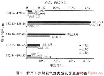 渝頁(yè)1井提撈的黑色巖心均為不含地層水的“干層”,即不含地層水(包括束縛水)的含氣層,若將隨機(jī)選取的巖心置于水中,則均將發(fā)生針尖狀氣泡不斷溢出的現(xiàn)象,視為頁(yè)巖氣的最直接證據(jù);此外,在鉆進(jìn)過(guò)程中,還多次在井筒中發(fā)現(xiàn)了氣泡溢出以及井口空氣中甲烷含量異常等現(xiàn)象,證實(shí)了頁(yè)巖中天然氣的直接存在。同時(shí),渝頁(yè)1井的16塊樣品現(xiàn)場(chǎng)解析表明,位于281.Om和287.5m井深處樣品的含氣量現(xiàn)場(chǎng)解析值最高,計(jì)算現(xiàn)場(chǎng)解析氣量達(dá)到并超過(guò)0.1m3/t(解析持續(xù)時(shí)間為6h)??紤]到井筒提心時(shí)間較長(zhǎng)(4.2h)、損失氣量及殘留氣量較多等原因,再結(jié)合已有解析曲線的比較研究,推測(cè)頁(yè)巖吸附含氣量大于1.0m3/t。結(jié)合頁(yè)巖總含氣量分析原理,初步計(jì)算頁(yè)巖總含氣量(吸附氣+游離氣)介于1.0~3.Om3/t之間,視為具有工業(yè)價(jià)值的頁(yè)巖氣。進(jìn)一步的色譜分析結(jié)果表明,天然氣樣品中同時(shí)含有甲烷和乙烷,在128.23~138.46m和206.75~209.18m井深等樣品中還發(fā)現(xiàn)了丙烷的存在(圖5)。其中,138.13~138.46m井深樣品中的甲烷、乙烷和丙烷含量分別為42.43%、0.42%、0.01%,其余為N2、CO2和O2等大氣成分。解吸樣品中烴類(lèi)氣體含量的百分比并不高,可能主要反映為解析儀中空氣樣品的殘留或地下風(fēng)化帶中少量空氣成分的進(jìn)入。