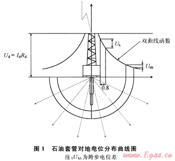 井架和石油套管遠遠超出常規(guī)的接地體尺寸,因此一般認為石油鉆機井架就是最好的巨型避雷針,石油套管就是最好的巨型接地體。當鉆臺上工頻下某相絕緣破壞或設備外殼帶電時,觸摸帶電設備外殼時的接觸電位為Ud,身體站立處的電位為U1:
