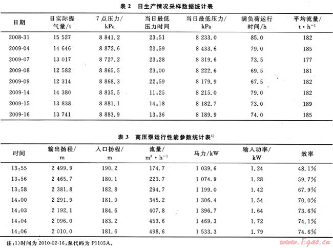 1) 繼續(xù)適量增大生產(chǎn)線的氣化能力。表2為日生產(chǎn)數(shù)據(jù)統(tǒng)計表,由表2可知,單臺氣化裝置的平均輸出流量基本在180t/h左右,如果ORV的海水進出口溫差小于5℃,增加高壓泵的流量可繼續(xù)增加氣化生產(chǎn)線的氣化能力。表3為高壓泵運行性能參數(shù)統(tǒng)計表。由表3可知,在流量為500m3/h時,高壓泵的功率在額定功率1800kW以內(nèi)。如果將氣化設(shè)備低壓泵、高壓泵和0RV的流量分別運行在500、450、430m3/h左右,設(shè)備仍運行在最佳效率區(qū)間且運行參數(shù)正常。