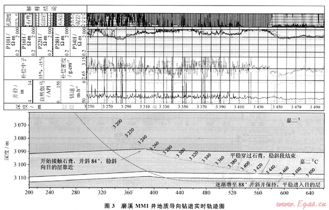 為避免鉆進(jìn)石膏層時(shí)發(fā)生卡鉆,設(shè)計(jì)開(kāi)始以4°狗腿造斜并在3300m把井斜增加到84°,之后保持井斜向目的層接近,并以旋轉(zhuǎn)鉆進(jìn)的方式來(lái)通過(guò)目的層上方的石膏層。在3440m鉆速由4.8m/h增加到8.4m/h,密度由2.99g/cm3減小到2.84g/cm3,中子增加到5.4%,電阻率也由1000Ω·m下降到200Ω·m,用校正后的中子和密度交會(huì)得到孔隙度為6%~10%,巖性為白云巖。結(jié)合鄰井測(cè)井資料和區(qū)域地質(zhì)資料,通過(guò)地層對(duì)比地層,綜合判斷3440m已進(jìn)入目的層,其后井斜逐漸增至88°并保持穩(wěn)斜(圖3)。