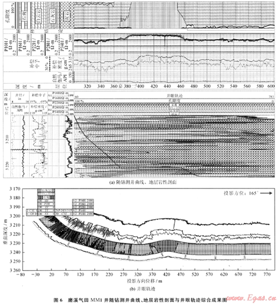 摘要:隨鉆地質(zhì)導(dǎo)向技術(shù)實(shí)現(xiàn)了以井下實(shí)際地質(zhì)特征來(lái)確定和控制井眼軌跡,達(dá)到了提高有效儲(chǔ)層鉆遇率的目的,對(duì)于高效開(kāi)發(fā)復(fù)雜氣藏具有重要意義。為此,簡(jiǎn)述了地震、測(cè)井聯(lián)合反演和三維可視化建模在地質(zhì)導(dǎo)向儲(chǔ)層預(yù)測(cè)中的作用,然后結(jié)合四川盆地中部磨溪?dú)馓颩M1水平井等多口井的產(chǎn)層導(dǎo)向鉆進(jìn)情況,總結(jié)出采用隨鉆測(cè)井(LWD)資料確定中靶點(diǎn)和鉆頭在目的層的位置,以及井眼軌跡、地層巖性剖面和隨鉆測(cè)井曲線綜合成圖與調(diào)整井眼軌跡等方法,并以此來(lái)指導(dǎo)磨溪?dú)馓锶B系嘉陵江組白云巖儲(chǔ)層的地質(zhì)導(dǎo)向鉆井施工,明顯提高了水平井目的層的鉆遇率和地質(zhì)導(dǎo)向鉆井的成功率,效果良好,值得推廣應(yīng)用。