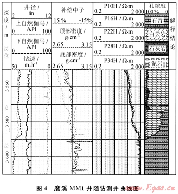 為調(diào)整鉆頭使其回到目的層,現(xiàn)場(chǎng)決定以7。狗腿減小井斜。經(jīng)過(guò)降斜到90°,鉆至3664m發(fā)現(xiàn)鉆速由3.8m/h增加到7.4m/h,密度由2.95g/cm3減小到2.80g/cm3,補(bǔ)償中子增加到7.7%,電阻率也由1800Ω·m降到200Ω·m,用校正后的中子和密度交會(huì)得到孔隙度為6%~10%,巖性為白云巖。表明儀器已經(jīng)由上部石膏層鉆回目的層。