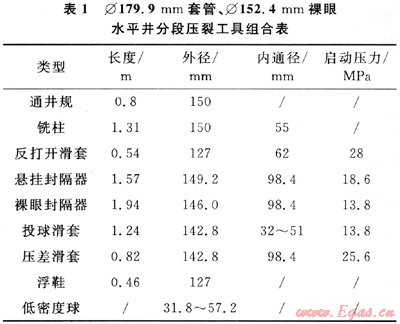 裸眼水平井分段壓裂需要的主要工具類型和參數(shù)見表1。按國際標(biāo)準(zhǔn),投球滑套內(nèi)通徑采用6.3mm梯度,分段級(jí)數(shù)小于等于6級(jí),采用3.175mm梯度,分段級(jí)數(shù)可達(dá)到10級(jí)[1]。