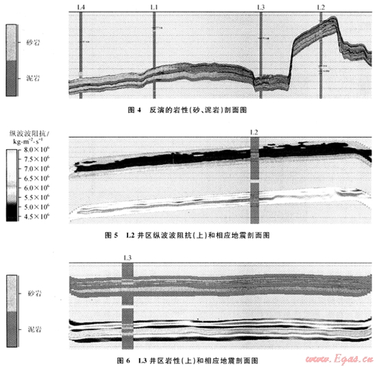 對比圖1~4,可以看出疊前隨機反演結(jié)果的垂直分辨率較疊前AVA同步反演結(jié)果有很大提高,地震資料無法分辨的L2井區(qū)的兩套薄砂層(圖5)和L3井區(qū)的砂泥互層(圖6)在反演結(jié)果中均表現(xiàn)十分清楚。該氣組儲層是低水位期在內(nèi)陸架環(huán)境中形成的近源風(fēng)暴席狀沙沉積,分布較穩(wěn)定。而反演結(jié)果中儲層橫向連續(xù)性也很好,符合該區(qū)的沉積相分布特征;同時上下層位的接觸關(guān)系與原始地震資料也吻合很好,進一步驗證了預(yù)測的可靠性。反演成果在該氣田的開發(fā)井設(shè)計優(yōu)化中得到了實際應(yīng)用,并為今后的氣田開發(fā)實施提供了有力的資料,有利于降低開發(fā)風(fēng)險、提高效率。