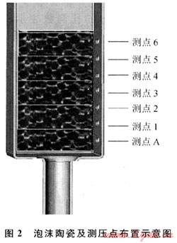 圖2為泡沫陶瓷及壓力測定點(diǎn)布置示意圖。用軟質(zhì)材料包裹泡沫陶瓷,放置在鋼管中,保證泡沫陶瓷周邊與鋼管內(nèi)表面的密封;在鋼管側(cè)面開有7個測壓孔,其間距為10mm。實(shí)驗(yàn)中對測點(diǎn)A與其他6個測點(diǎn)的壓力差用數(shù)字微壓差計(jì)進(jìn)行8次測量,取平均值;空截面風(fēng)速由畢托管在實(shí)驗(yàn)段出口處的不同位置也進(jìn)行8次測量,取其平均值。實(shí)驗(yàn)所采用的泡沫陶瓷規(guī)格為50mm×50mm×20mm,PPI分別為10、20、30,空隙率為88%。