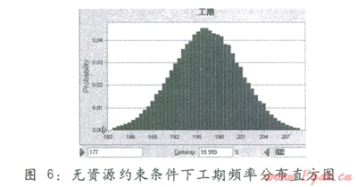 可知,模擬工期分布范圍為[177,214],平均值為200;由表3可知,資源約束條件下蒙特卡洛計(jì)算所得模擬工期分布范圍為[172,210],平均值為194,該方法所得模擬工期方差為l6,小于無資源約束條件下模擬工期方差21。這是因?yàn)榭紤]資源約束條件后,各活動(dòng)歷時(shí)隨機(jī)浮動(dòng)的同時(shí)受到了資源的約束,所以其浮動(dòng)變小了,對(duì)項(xiàng)目工期的浮動(dòng)的貢獻(xiàn)有了一定的消減作用,充分體現(xiàn)了資源在項(xiàng)目中的重要地位。同時(shí),本項(xiàng)目實(shí)際完成時(shí)間為193天,顯然資源約束條件下模擬工期平均值更接近實(shí)際項(xiàng)目工期。因此,從IT項(xiàng)目實(shí)際情況出發(fā),考慮資源約束的模擬能更準(zhǔn)確地預(yù)測項(xiàng)目工期,有更強(qiáng)的實(shí)用性。