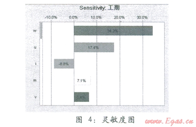 綜合以上分析,活動(dòng)W、u等均以較高的概率出現(xiàn)在關(guān)鍵路徑上,同時(shí)由靈敏度圖可知兩個(gè)活動(dòng)歷時(shí)和項(xiàng)目工期相互關(guān)聯(lián)系數(shù)較大,因此對(duì)于此類活動(dòng)應(yīng)該高度關(guān)注。