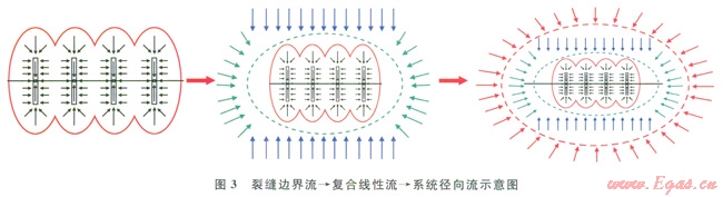 在復(fù)合線性流后,壓力擾動(dòng)會(huì)進(jìn)一步向周圍儲(chǔ)層傳播?;趦?chǔ)層的兒何形狀和邊界條件,可能會(huì)出現(xiàn)以下3種情況:封閉邊界(擬穩(wěn)態(tài))、定壓邊界或無(wú)限大邊界。