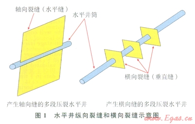 通常水平井分段壓裂裂縫存在2種極限情況:縱向和橫向(圖1)。當(dāng)水平井井筒方位與最大水平主應(yīng)力方位垂直時(shí),可產(chǎn)生橫向裂縫;當(dāng)兩者方位一致時(shí),可產(chǎn)生軸向裂縫(縱向裂縫);當(dāng)兩者夾角處于其他情況時(shí),裂縫形態(tài)會(huì)非常復(fù)雜。由于水平井軸向裂縫有效泄流面積相對(duì)橫向裂縫來(lái)說(shuō)小很多,一般希望水平井壓裂產(chǎn)生橫向裂縫作為裂縫網(wǎng)絡(luò)的主裂縫。頁(yè)巖氣井最佳的壓裂效果是產(chǎn)生垂直于水平井段的橫向主裂縫的同時(shí),產(chǎn)生垂直于橫向裂縫的二級(jí)裂縫,以提高裂縫與地層的接觸面積,有利于頁(yè)巖氣的解吸附和氣體在儲(chǔ)層中的流動(dòng)。據(jù)統(tǒng)計(jì),水平井分段壓裂的裂縫以橫向裂縫為主[3-5]。