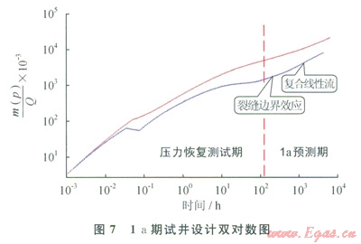從圖7中的la預(yù)測(cè)期可以看出,壓力恢復(fù)測(cè)試期過(guò)后表現(xiàn)為裂縫邊界流和復(fù)合線性流特征,氣井生產(chǎn)1a仍然沒(méi)有出現(xiàn)系統(tǒng)徑向流和外邊界效應(yīng),同時(shí)也驗(yàn)證了測(cè)試期出現(xiàn)的線性流和徑向流分別為早期線性流和早期徑向流。