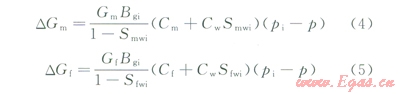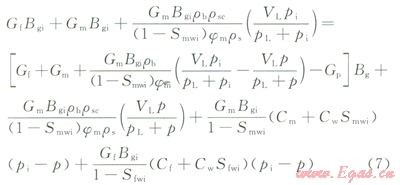 根據(jù)頁(yè)巖氣藏地下儲(chǔ)集空間體積平衡原理,基質(zhì)系統(tǒng)原始游離氣體積+裂縫系統(tǒng)原始游離氣體積+原始吸附氣吸附相體積=剩余游離氣體積+剩余吸附相體積+基質(zhì)體系巖石與束縛水膨脹體積+裂縫體系巖石與束縛水膨脹體積,其中剩余游離氣體積南剩余的原始游離氣及剩余的解吸氣組成,即