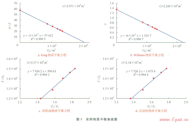 根據(jù)上述數(shù)據(jù),利用King物質(zhì)平衡方程、williams物質(zhì)平衡方程、劉鐵成物質(zhì)平衡方程及筆者提出的改進(jìn)的物質(zhì)平衡方程,計(jì)算了該實(shí)例頁(yè)巖氣井的原始地質(zhì)儲(chǔ)量(圖1)。