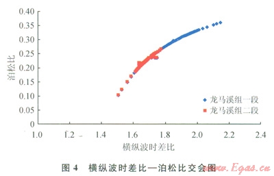 整體龍馬溪組楊氏模量介于l×104~3.5×104MPa,平均為2.3×104MPa;泊松比介于0.1~0.37,平均為0.24。通過(guò)圖3可以看出,龍馬溪組一段楊氏模量平均值為1.4×104MPa,泊松比平均值為0.3;龍馬溪組二段楊氏模量平均值為l.8×104MPa,泊松比平均值為0.23。龍馬溪組二段較龍馬溪組一段具有低泊松比,高楊氏模量,說(shuō)明其脆性優(yōu)于一段。圖4為橫縱波時(shí)差比和泊松比的交會(huì)圖,可以看出龍馬溪組二段的橫縱波時(shí)差比明顯低于一段,說(shuō)明低橫縱波時(shí)差比參數(shù)用于表征頁(yè)巖的脆性程度是有效的。