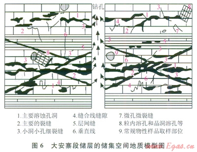 圖6為綜合上述各項(xiàng)儲(chǔ)集空間特征的儲(chǔ)層地質(zhì)模型[19],從中不難確定,對(duì)大安寨段儲(chǔ)層貢獻(xiàn)最大的無(wú)疑是各類裂縫及沿裂縫溶蝕形成的各類溶縫、溶孔和溶洞,其次為晶間孔,溶蝕微孔和微縫雖然很小,但數(shù)量眾多,其貢獻(xiàn)也不容忽視。