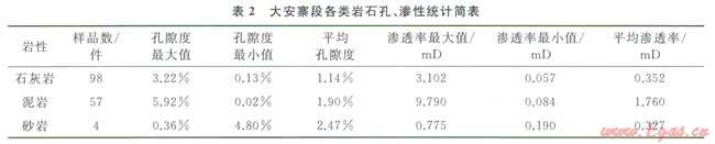 大安寨段主體以石灰?guī)r和頁(yè)巖為主,部分為過(guò)渡類型的泥質(zhì)灰?guī)r和鈣質(zhì)泥巖,少量為粉一細(xì)粒砂巖。從孔、滲性統(tǒng)計(jì)結(jié)果(表2),可以看出,大安寨段砂巖的平均孔隙度相對(duì)較高,為2.47%,但滲透率最低為0.327mD,石灰?guī)r孔隙度和滲透率都為最低,平均值分別為1.14%和0.352mD,而泥頁(yè)巖的平均孔隙度居中,為1.9%,平均滲透率則高達(dá)l.76mD。由此可以看出,大安寨段中最有利儲(chǔ)層發(fā)育的巖性并非為石灰?guī)r和砂巖,近期的勘探實(shí)踐也證明了大安寨段儲(chǔ)層的發(fā)育特征,表現(xiàn)出有悖于常規(guī)石油地質(zhì)理論的3大特點(diǎn):①介殼灰?guī)r的物性有隨石灰?guī)r中泥質(zhì)含量增加,孔隙度雖然變化不大,而滲透率卻趨于上升的特點(diǎn),原因可能在于介殼灰?guī)r中的泥質(zhì)在成巖過(guò)程中具有收縮作用,有利于粒緣和粒間成巖收縮縫的發(fā)育;②大安寨段儲(chǔ)層并非為單一巖石類型,而是各類石灰?guī)r,特別是泥質(zhì)介殼灰?guī)r與碳質(zhì)頁(yè)巖的不等厚互層組合體,無(wú)論是在剖面上還是平面上(圖2、3),都位于偏向半深湖一側(cè)的介殼灘灘緣和湖坡帶,具有較穩(wěn)定的層位和較大分布范圍;③介殼灰?guī)r與碳質(zhì)頁(yè)巖互層組合體中,滲透率隨著頁(yè)巖夾層增多加厚而趨于降低,說(shuō)明組合體中頁(yè)巖夾層過(guò)多也不利于儲(chǔ)層發(fā)育。