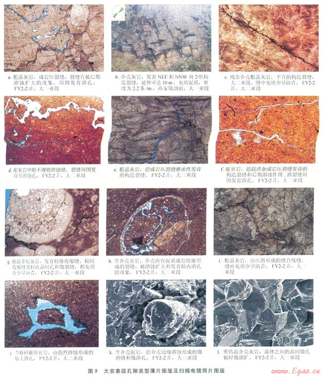 該區(qū)大安寨段由溶蝕形成的溶孔也較為發(fā)育,為次重要儲(chǔ)集空間類型,主要發(fā)育在各類石灰?guī)r中。溶孔和溶洞是在早期孔隙和裂縫的基礎(chǔ)上,在埋藏成巖過(guò)程中經(jīng)深部熱液溶蝕擴(kuò)大而成[18-19],孔徑介于0.0l~2mm的為溶孔(圖5-j),大于2mm為的溶洞,個(gè)別可超過(guò)10mm,環(huán)邊生長(zhǎng)有方解石晶簇的為晶洞。溶孔、溶洞和晶洞數(shù)量很少,但在各層段均有分布,分布在裂縫較發(fā)育的介殼灰?guī)r和含介殼泥頁(yè)巖中(圖5-a、d、f、h),常伴生豐富的粒緣微溶縫和微溶孔(圖5-k)。
