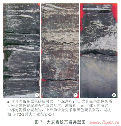 大安寨段頁(yè)巖類型豐富,而具備成藏條件的頁(yè)巖主體為半深湖—湖坡相的薄層狀暗色碳質(zhì)頁(yè)巖,頁(yè)巖中往往含介殼條帶或夾有薄層狀黑色碳泥質(zhì)介殼灰?guī)r(圖7),而淺湖、濱湖相的灰色和雜色頁(yè)巖、粉砂質(zhì)頁(yè)巖、鈣質(zhì)頁(yè)巖等不具備頁(yè)巖氣成藏條件。碳質(zhì)頁(yè)巖厚度對(duì)頁(yè)巖氣的勘探開(kāi)發(fā)具有重要意義,特點(diǎn)為:①大一亞段碳質(zhì)頁(yè)巖主要出現(xiàn)在下部,為與薄層碳泥質(zhì)介殼灰?guī)r互層組合,碳質(zhì)頁(yè)巖的累計(jì)厚度為8~12m;②大二亞段由大套碳質(zhì)頁(yè)巖夾泥質(zhì)介殼灰?guī)r條帶或薄層組成,單層頁(yè)巖的厚度一般不超過(guò)2m,累計(jì)厚度為30~50m;③大三亞段碳質(zhì)頁(yè)巖出現(xiàn)在上部,也為與薄層碳泥質(zhì)介殼灰?guī)r互層組合,碳質(zhì)頁(yè)巖的累計(jì)厚度很小,僅為2~5m。需指出的是,大安寨段碳質(zhì)頁(yè)巖的發(fā)育不僅具有從大三亞段上部經(jīng)大二亞段至大一亞段下部的連續(xù)沉積特點(diǎn)(圖2),而且40~60m的總累計(jì)厚度在湖坡和半深湖亞相區(qū)(圖3、4)范圍內(nèi)的分布非常穩(wěn)定,對(duì)照美國(guó)密執(zhí)安盆地Antrim頁(yè)巖氣藏最小頁(yè)巖厚度僅為9.1m,特沃斯盆地Barnett頁(yè)巖氣藏30.5m的頁(yè)巖厚度已被證明具有商業(yè)開(kāi)采價(jià)值的現(xiàn)狀[21],該區(qū)大安寨碳質(zhì)頁(yè)巖的厚度已完全具備形成頁(yè)巖氣藏的條件。