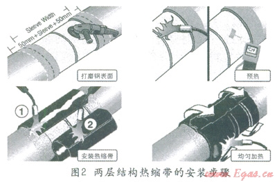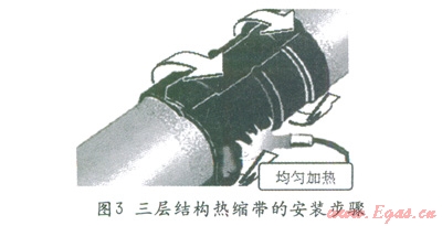 兩層結(jié)構(gòu)熱縮帶施工簡單,只需要對海管節(jié)點裸鋼表面進(jìn)行打磨、預(yù)熱就可以安裝熱縮帶了。安裝過程只需要將熱縮帶纏繞在節(jié)點上,按要求均勻加熱,熱縮帶就會收縮,緊緊的固定在節(jié)點鋼表面上。一般只需要占用鋪管作業(yè)線的一個站點,兩個人用五分鐘左右就可以完成一個節(jié)點的防腐施工。
