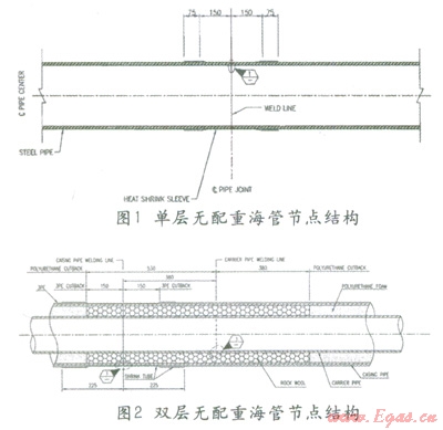 不同結(jié)構(gòu)的海管也有多種不同結(jié)構(gòu)的節(jié)點,無配重海管的普通節(jié)點結(jié)構(gòu)如圖l、2所示。此外常見的海管還有單層配重管、單層保溫管、雙層配重管等多種結(jié)構(gòu)。