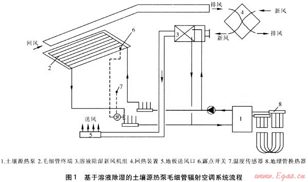 基于溶液除濕的土壤源熱泵毛細(xì)管輻射空調(diào)系統(tǒng)發(fā)展很快[1~5],系統(tǒng)流程見(jiàn)圖1。采用溫濕度獨(dú)立處理原理控制室內(nèi)熱濕環(huán)境:向室內(nèi)送入經(jīng)溶液除濕新風(fēng)機(jī)組處理后的干燥空氣控制濕度和滿足新風(fēng)需求,采用獨(dú)立的毛細(xì)管輻射空調(diào)系統(tǒng)消除顯熱控制室內(nèi)溫度,從而全面調(diào)節(jié)室內(nèi)熱濕環(huán)境。用土壤源熱泵作為系統(tǒng)的冷源,采用地板送風(fēng)口送入新風(fēng),吸收室內(nèi)余熱余濕的排風(fēng)與新風(fēng)進(jìn)行全熱交換。毛細(xì)管輻射空調(diào)系統(tǒng)由毛細(xì)管終端、獨(dú)立新風(fēng)系統(tǒng)、控制系統(tǒng)組成: