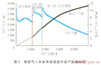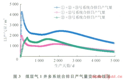 ①號系統(tǒng)和②號系統(tǒng)合排,最高產(chǎn)氣量約為2000m3/d,平均產(chǎn)氣量為950m3/d左右,1000m3/d產(chǎn)量可持續(xù)2800d左右(圖3),15a累計(jì)產(chǎn)量為4.68×106m3;②號系統(tǒng)和③號系統(tǒng)合排,最高產(chǎn)氣量也在2000m3/d左右,平均產(chǎn)氣量為1100m3/d左右,1500m3/d日產(chǎn)量持續(xù)2000d左右,15a累計(jì)產(chǎn)量為5.39×106m3;①、②、③這3個系統(tǒng)合排,最高產(chǎn)氣量達(dá)到4300m3/d,平均產(chǎn)氣量為2100m3/d左右,2000m3/d產(chǎn)量可持續(xù)3300d左右,l5a累計(jì)產(chǎn)量為10.45×106m3。實(shí)際排采時由于各系統(tǒng)壓力不同,系統(tǒng)間相互干擾,并非所有含氣系統(tǒng)都有產(chǎn)能貢獻(xiàn)。