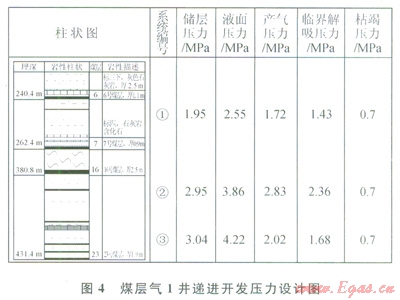 由于各含氣系統(tǒng)壓力不同,合層排采會產(chǎn)生層間干擾。煤層氣l井鉆井、固井結(jié)束后,由靜止液而高度計(jì)算得出①、②、③號含氣系統(tǒng)的液而壓力分別為2.55、3.86、4.22MPa(圖4),分別比各系統(tǒng)的儲層壓力高0.6、0.91、1.18MPa,若井孔處理不干凈的話,對煤儲層有一定程度的污染。基于實(shí)測含氣量、蘭格繆爾參數(shù)計(jì)算①、②、③號含氣系統(tǒng)的臨界解吸壓力分別為1.43、2.36、1.68MPa,產(chǎn)氣壓力分別為l.72、2.83、2.02MPa(基于山西沁水盆地南部煤層氣井排采實(shí)踐,產(chǎn)氣壓力約為臨界解吸壓力的1.2倍[16-19]。依據(jù)煤層氣l井各系統(tǒng)內(nèi)煤儲層壓力、臨界解吸壓力和產(chǎn)氣壓力,對3個含氣系統(tǒng)設(shè)計(jì)了遞進(jìn)開發(fā)次序。