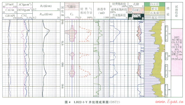 圖4顯示LD22-1-Y井963~985m段測井定量計(jì)算烴類氣含量為75%左右,測試證實(shí)該層甲烷含量為81%。通過鶯歌海盆地l5口井19個(gè)層位測井計(jì)算烴類氣含量與實(shí)測結(jié)果對(duì)比,在統(tǒng)計(jì)的l9層中,絕對(duì)誤差在20%以內(nèi)的層有l5層,占79%;絕對(duì)誤差在10%以內(nèi)的層有l2層,占63%[13]。表明該定量方法能較為有效地計(jì)算烴類氣含量,從而達(dá)到區(qū)分烴類氣與非烴氣的目的。