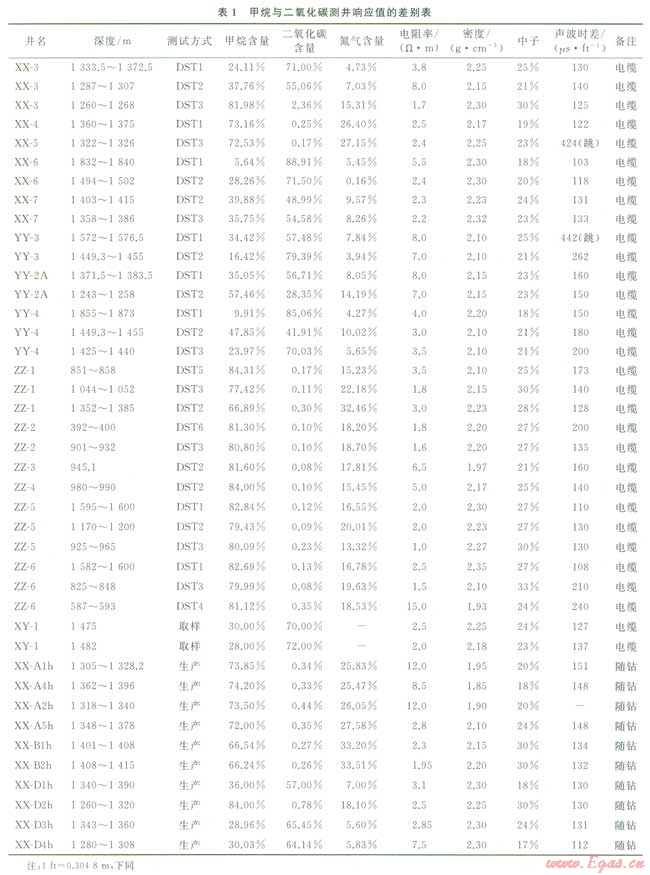 烴類氣與二氧化碳?xì)鈱釉跍y井曲線上的響應(yīng)特征與油、水層有較明顯的區(qū)別,而它們兩者之間的差異卻較小,這是造成用測井資料區(qū)分甲烷和二氧化碳困難的根本原因。但通過對(duì)二者理論上測井響應(yīng)值的研究可知,兩者還是存在一定的差別,因而兩種氣體在測井曲線上必定存在或多或少的差異,這是用測井資料定性、定量區(qū)分烴類氣與二氧化碳?xì)獾幕A(chǔ)[4]。