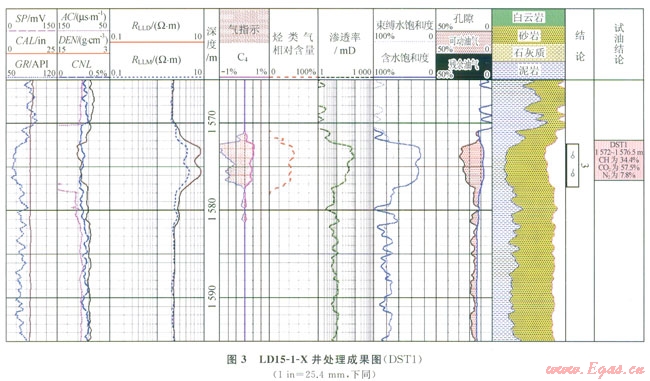 圖3顯示LDl5-1-X井1572~1577m段第2道中子密度出現(xiàn)交會(huì),第3道電阻率增大,第5道孔隙度差、比值識(shí)別法出現(xiàn)明顯的氣層“包絡(luò)”特征,第8道測井計(jì)算的含水飽和度與束縛水飽和度幾乎重合,含水飽和度大致為30%,第6道為該方法定量計(jì)算出的烴類氣相對(duì)含量,大概在40%左右,DST測試證實(shí)該層甲烷含量為34.4%,測試的結(jié)果與定量計(jì)算的結(jié)果相近。