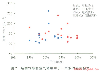 通過分析圖1、2可以發(fā)現(xiàn),中子測井與密度測井能較好地區(qū)分以甲烷為主的烴類氣層與二氧化碳?xì)鈱樱宦暡y井對(duì)兩類氣體的區(qū)別能力相對(duì)較差。隨鉆測井資料由于是地層剛鉆開時(shí)獲得的資料,對(duì)兩者的區(qū)分效果要比電纜測井資料好[11]。
