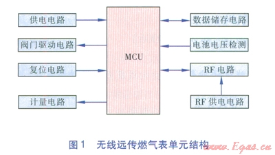 無線遠(yuǎn)傳燃?xì)獗碛杀砭摺?span lang="EN-US">MCU(Micro Controller Unit,微控制單元)、通信模塊(RF電路)、計(jì)數(shù)采樣裝置、控制機(jī)構(gòu)等單元組成。其中,MCU采用l6位單片機(jī),該單片機(jī)具有功耗低、運(yùn)算速度快、可在線編程等優(yōu)點(diǎn)。通信模塊采用3種工作頻率(433、868、915MHz,分別為中國(guó)、歐洲國(guó)家、美國(guó)采用的工作頻率)的RF電路,采用GFSK(Gauss Frequency Shift Keying,高斯頻移鍵控)調(diào)制模式,具有極好的頻率穩(wěn)定性和較高的接收靈敏度,符合國(guó)家無線電管理委員會(huì)的相關(guān)規(guī)定。無線遠(yuǎn)傳燃?xì)獗韱卧Y(jié)構(gòu)見圖l。
