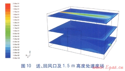 送回風(fēng)口中心面溫度場(chǎng)見(jiàn)圖6,南北向、東西向中心面溫度場(chǎng)見(jiàn)圖7。送回風(fēng)口立面、南北向中心面速度場(chǎng)見(jiàn)圖8,東西向中心面速度場(chǎng)見(jiàn)圖9,送、回風(fēng)口及1.5m高度處速度場(chǎng)見(jiàn)圖l0。由圖6、7可知,采用新風(fēng)除濕輔助毛細(xì)管輻射供冷系統(tǒng)的房間,室內(nèi)溫度在舒適范圍內(nèi),垂直方向溫度梯度小,舒適性更強(qiáng)。由圖8~10可知,工作區(qū)內(nèi)風(fēng)速在0.3m/s左右,無(wú)吹風(fēng)感。