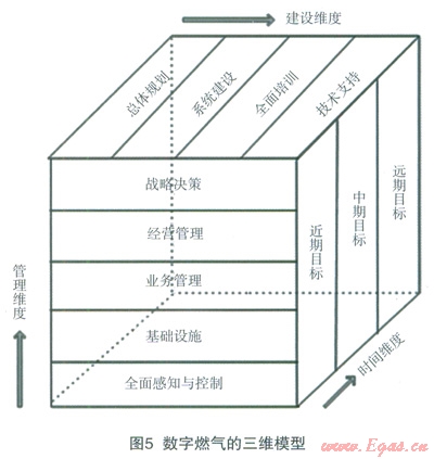 根據(jù)以上討論,我們可以按照管理、建設(shè)、時間三個維度來建立一個三維的數(shù)字燃氣建設(shè)模型,這樣可以形象地描述燃氣集團(公司)的數(shù)字燃氣建設(shè)的階段與狀態(tài),圖5所示。