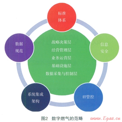 數(shù)字燃氣在軟件方面包含戰(zhàn)略決策層、經(jīng)營管理層、業(yè)務(wù)運營層三個層面的內(nèi)容,硬件方面包含基礎(chǔ)設(shè)施層、數(shù)據(jù)采取與控制層兩個層面。除此之外,我們認為數(shù)據(jù)燃氣還應當包括燃氣公司的數(shù)據(jù)規(guī)范的制定、技術(shù)標準體系的制定、信息安全管理、IT治理與管控,以及系統(tǒng)集成架構(gòu)的建設(shè)等內(nèi)容。圖2是數(shù)字燃氣范疇的示意圖。