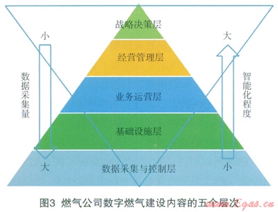 我們將燃氣公司數(shù)字燃氣的建設(shè)內(nèi)容劃分為戰(zhàn)略決策、經(jīng)營管理、業(yè)務(wù)運營、基礎(chǔ)設(shè)施、數(shù)據(jù)采集與控制五個層次,如圖3所示。其中上而三層屬于軟件系統(tǒng)范疇,下面兩層屬于硬件設(shè)施范疇。