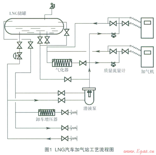 LNC汽車加氣站具有卸車、儲(chǔ)存、增壓、加氣等工藝過(guò)程,南此形成了相應(yīng)的T藝流程,見圖l。