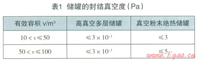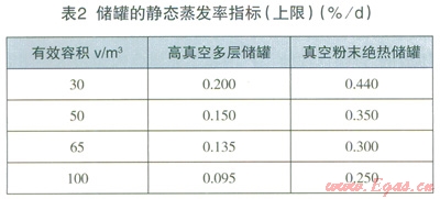 (2)設(shè)計(jì)文件應(yīng)對(duì)LNG儲(chǔ)罐提出明確的保冷指標(biāo)要求。不論是真空粉末絕熱儲(chǔ)罐還是高真空多層絕熱儲(chǔ)罐對(duì)保冷都應(yīng)有明確的要求,即某體積的儲(chǔ)罐都應(yīng)對(duì)應(yīng)相應(yīng)的真空度和靜態(tài)蒸發(fā)率,超過(guò)這些數(shù)值指標(biāo)就達(dá)不到保冷效果,蒸發(fā)氣體產(chǎn)生量就會(huì)增加,應(yīng)及時(shí)抽真空處理或采取其他措施。綜合相關(guān)規(guī)范和工程實(shí)踐,提出儲(chǔ)罐的保冷指標(biāo)要求,儲(chǔ)罐的封結(jié)真空度指標(biāo)要求見表1,靜態(tài)蒸發(fā)率指標(biāo)(上限)要求見表2。