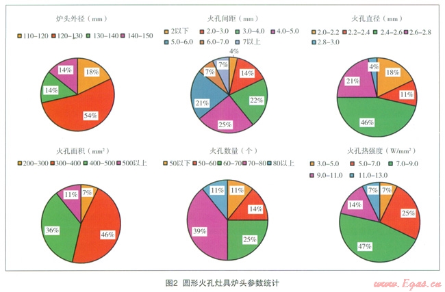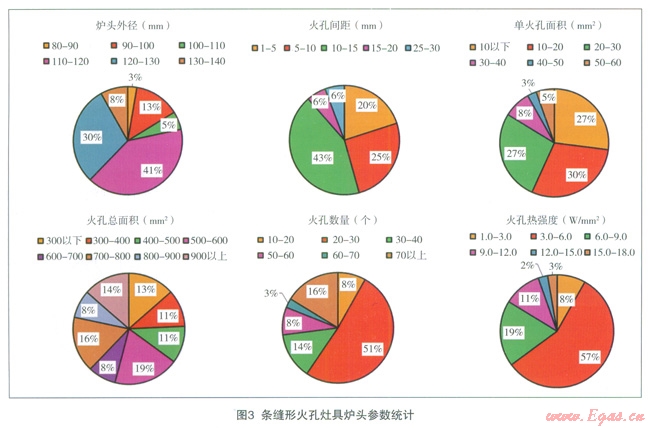 本文通過(guò)對(duì)65臺(tái)目前中國(guó)燃具市場(chǎng)上常見(jiàn)的民用大氣式燃?xì)庠罹郀t頭進(jìn)行調(diào)研,著重統(tǒng)計(jì)分析了目前中國(guó)灶具廠商出廠的各類灶具爐頭的不同火孔類型、火孔尺寸、火孔間距、火孔數(shù)量、火孔熱強(qiáng)度以及灶具額定熱負(fù)荷等數(shù)據(jù),并對(duì)部分樣本灶具進(jìn)行不同氣質(zhì)情況下的熱效率和CO排放性能分析,以驗(yàn)證不同爐頭設(shè)計(jì)對(duì)氣源氣質(zhì)變化的適應(yīng)能力。