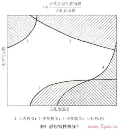 對(duì)于大氣式燃燒器,其典型燃燒特性曲線如圖4所示。,當(dāng)氣源氣質(zhì)發(fā)生變化時(shí),燃燒器設(shè)計(jì)火孔熱強(qiáng)度過(guò)大,極易出現(xiàn)CO排放問(wèn)題;而設(shè)計(jì)一次空氣系數(shù)過(guò)大且火孔熱強(qiáng)度過(guò)小,燃燒器容易發(fā)?;鼗?,火孔熱強(qiáng)度設(shè)計(jì)過(guò)大則易導(dǎo)致離焰;對(duì)于一次空氣系數(shù)過(guò)小的燃燃燒器爐頭,選擇合適的設(shè)計(jì)工況點(diǎn)(一次空氣系數(shù)和火孔熱強(qiáng)度),將直接影響燃燒器應(yīng)對(duì)氣源氣質(zhì)變化的適應(yīng)能力。另一方面,火孔尺寸過(guò)大、火孔間距過(guò)小、爐頭外徑偏小,易使得火孔分布緊密、火焰變軟連焰,從而導(dǎo)致CO排放增加、熱效率降低;反之則火孔過(guò)于分散、火焰較硬、傳熱效果變差,熱效率不理想,某些情況同樣會(huì)導(dǎo)致燃燒不完全,出現(xiàn)污染物排放問(wèn)題[10]。就此,根據(jù)上面爐頭設(shè)計(jì)參數(shù)統(tǒng)計(jì)結(jié)果,本文定義一無(wú)因次參數(shù)e來(lái)綜合捕述民用灶具爐頭火孔大小、間距、個(gè)數(shù)同爐頭大小的關(guān)系,從而評(píng)價(jià)爐頭設(shè)計(jì)情況: