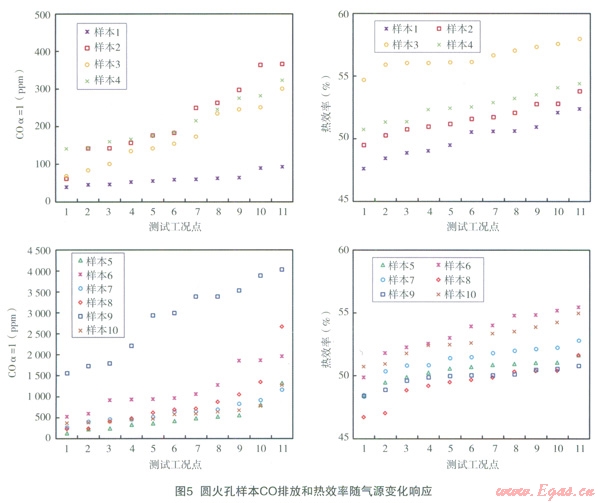 對(duì)10臺(tái)圓形火孔樣本的CO排放和熱效率性能在11種氣源情況下的響應(yīng)分析列于圖5。其中,樣本1~4所有測(cè)試工況下的CO排放響應(yīng)值均在國(guó)標(biāo)要求的500×10-6以下,且除樣本l的5個(gè)測(cè)試工況外,其他所有測(cè)試工況點(diǎn)的熱效率響應(yīng)均在國(guó)標(biāo)規(guī)定的50%以上。說(shuō)明這4臺(tái)樣本的適應(yīng)能力較強(qiáng),能較好的應(yīng)對(duì)氣源氣質(zhì)變化。統(tǒng)計(jì)4臺(tái)樣本的爐頭設(shè)計(jì)發(fā)現(xiàn),設(shè)計(jì)火孔熱強(qiáng)度為7.2W/mm2 ~8.4W/mm2,爐頭外徑選擇在125mm~135mm內(nèi),設(shè)計(jì)火孔總面積為350mm2~430mm2,e值分布在30~40之間。樣本5~10的CO排放響應(yīng)表現(xiàn)并不理想,其中樣本6和9所有測(cè)試工況CO排放均在500×10-6以上,其他4臺(tái)樣本過(guò)半數(shù)測(cè)試工況點(diǎn)CO排放超標(biāo);熱效率響應(yīng)方面除樣本8和9外,其他4臺(tái)樣本表現(xiàn)尚屬理想;但若同時(shí)考慮CO排放和熱效率,則發(fā)現(xiàn)樣本5~10的沒(méi)計(jì),均是在保證熱效率達(dá)標(biāo)的前提下?tīng)奚?span lang="EN-US">CO排放,實(shí)際應(yīng)用中不建議采用這類“高效率高排放”的燃?xì)庠?。統(tǒng)計(jì)6臺(tái)樣本的爐頭設(shè)計(jì)發(fā)現(xiàn),其中5臺(tái)樣本的設(shè)計(jì)火孔熱強(qiáng)度均大于llW/mm2,最大達(dá)到了l5.2W/mm2,爐頭外徑則集中在l20mm~130mm和l40mm~150mm兩個(gè)范圍,設(shè)計(jì)火孔總面積為260mm2~300mm2,e值整體較大分布在40~65之間。故,如圖4所示高火孔熱強(qiáng)度易出現(xiàn)CO排放問(wèn)題;爐頭直徑過(guò)大則會(huì)導(dǎo)致中心火焰二次空氣供給變差,燃燒效率降低,污染物排放不理想;e值選擇過(guò)大,則反映出爐頭火孔分布不合理,火孔過(guò)于分散,火焰較硬,傳熱效果變差影響熱效率。