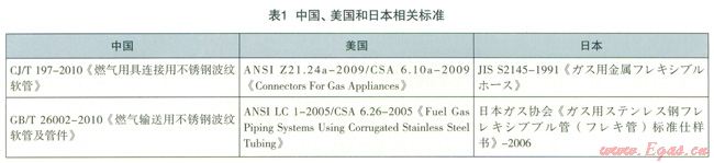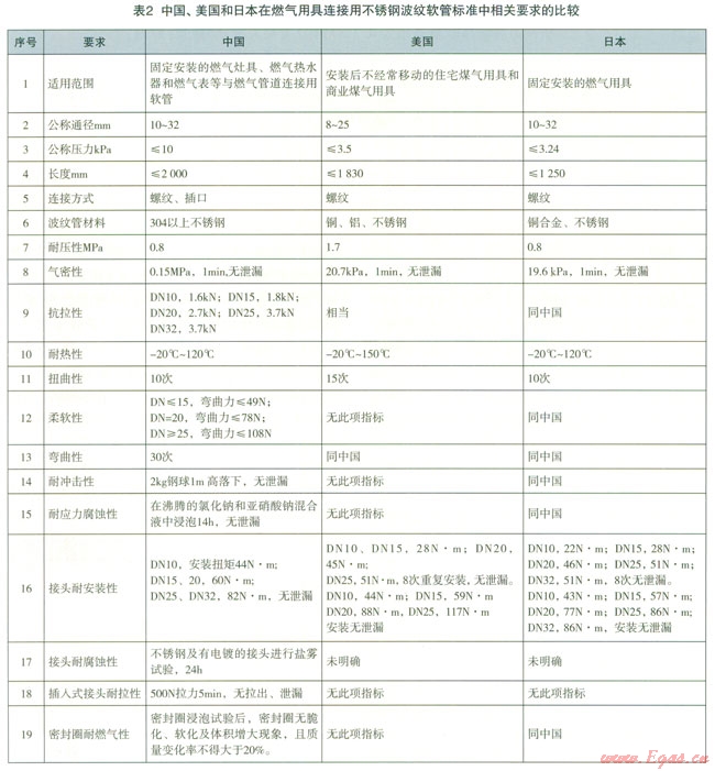 最早的CJ/T l97—2004《燃氣用不銹鋼波紋軟管》標準把燃具用連接軟管和輸送管道用軟管放在了一起,技術(shù)性能要求也基本一致,在后來的實際應(yīng)用中出現(xiàn)了問題:輸送管道用軟管在疲勞試驗方面的彎曲性能要求不需要很高,但是對波紋管管體的強度和使用壽命要求相應(yīng)更高;而燃具連接用軟管需要柔軟性好,對彎曲和扭曲的疲勞壽命也要求更高。同時,經(jīng)過國內(nèi)廠家的努力,我們的設(shè)計水平和制造工藝也大大縮小了和美國、日本的同類產(chǎn)品的差距,而美國和日本對這兩種產(chǎn)品有不同的標準,見表1。在中國市政工程華北設(shè)計研究總院相關(guān)領(lǐng)導(dǎo)和專家的努力下,按照產(chǎn)品的使用功能把一個標準分成兩個標準,是非常及時和必要的。