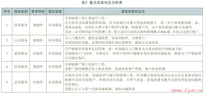 在通過上門服務(wù)、專項調(diào)查、定期走訪、業(yè)務(wù)回訪、服務(wù)熱線、營業(yè)咨詢、市長熱線、民心橋等多種信息收集手段的基礎(chǔ)上,對l0大服務(wù)類別的3層次需求特性進行滿足度分析(見表l)。細分各項服務(wù)滿足客戶需求程度是尋找服務(wù)改善點的基礎(chǔ)。