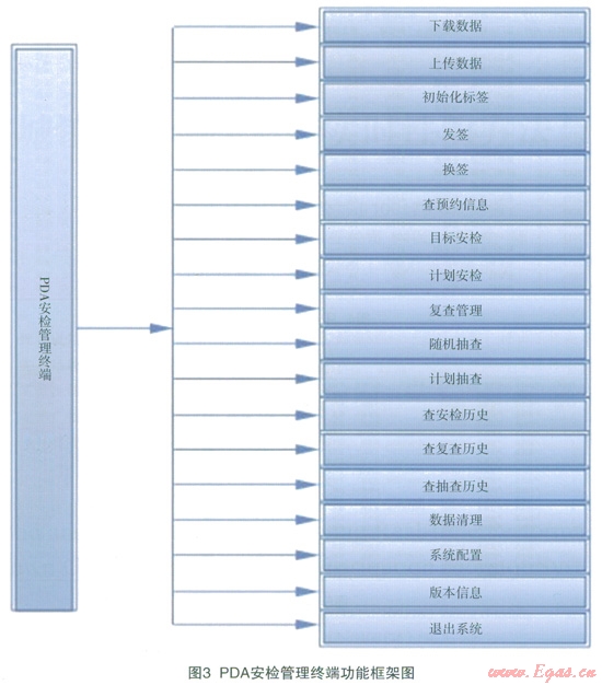 PDA安檢管理終端為安檢人員進(jìn)行發(fā)簽、安檢、復(fù)查、換簽,以及安檢管理人員的安檢抽查提供現(xiàn)場(chǎng)操作手段。PDA安檢管理終端功能框架圖如圖3所示: