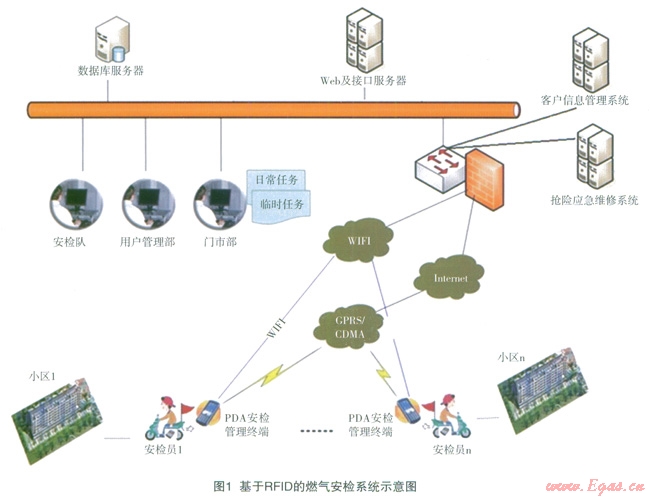 系統(tǒng)通過在已安裝氣表上張貼RFID標(biāo)簽或由氣表生產(chǎn)廠家將RFID內(nèi)置于氣表內(nèi)的方式,為每個(gè)氣表賦予一個(gè)唯一標(biāo)識(shí)氣表的RFID編號(hào)。燃?xì)夤臼紫戎贫甓劝矙z計(jì)劃,并分解為月度安檢計(jì)劃,再分解到每個(gè)班組及個(gè)人。安檢人員通過PDA安檢管理終端下載自己的安檢計(jì)劃,并按照安檢計(jì)劃進(jìn)行安檢。安檢時(shí),安檢人員必須入戶掃描氣表上的RFID標(biāo)簽,得到RFID標(biāo)簽上存儲(chǔ)的氣表編號(hào)和最近三次安檢的信息。同時(shí),安檢人員可選擇存PDA安檢管理終端上錄入安檢結(jié)果,并對(duì)隱患拍照。安檢結(jié)果及照片可通過PDA安檢管理終端傳送到燃?xì)夤具M(jìn)行審核、分析、處理。如果發(fā)現(xiàn)需要燃?xì)夤咎幚淼膰?yán)重隱患,可以通過安檢系統(tǒng)接口在燃?xì)夤緭岆U(xiǎn)維修管理系統(tǒng)中創(chuàng)建派修工單,以便搶險(xiǎn)維修人員處理。圖1是系統(tǒng)工作原理圖。