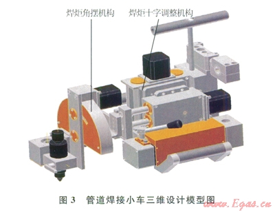 焊接小車主要由焊炬角擺機構(gòu)與焊炬十字調(diào)整機構(gòu)構(gòu)成(圖3)。其中,焊炬角擺機構(gòu)可實現(xiàn)焊炬最佳的角擺角度和擺動頻率,有效避免焊接過程中產(chǎn)生未熔缺陷;焊炬十字調(diào)整機構(gòu)可實現(xiàn)焊炬上下位置的調(diào)整與相對于焊縫寬度的左右位置調(diào)整,以滿足管道焊縫不同位置焊絲與管壁的間距要求及寬度要求。